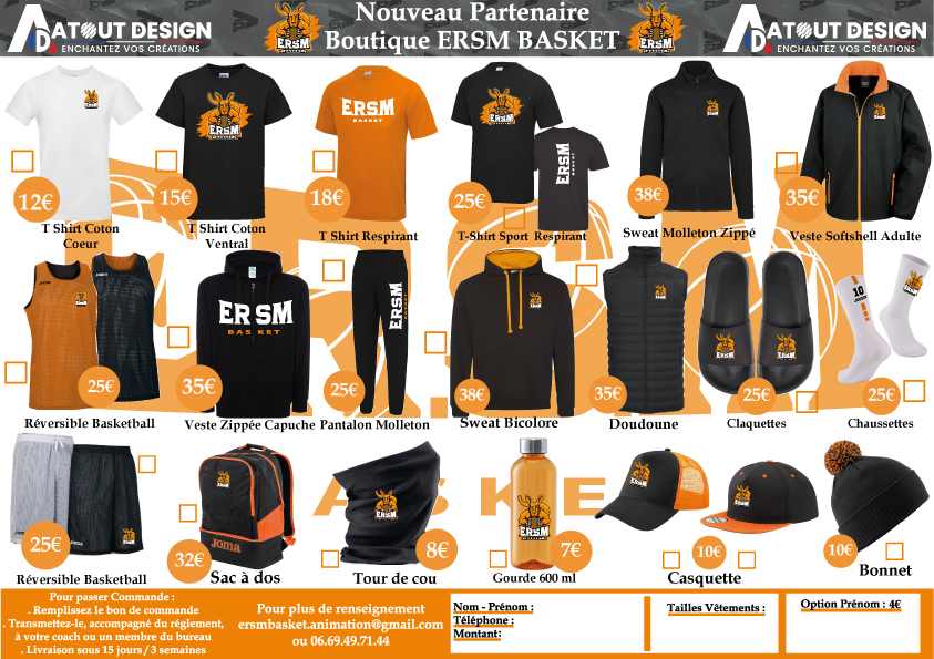 La boutique de l'ERSM : t-shirts, sweats, vestes, sacs, gourdes, claquettes, bonnets…